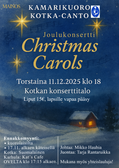 11.12.2025 Christmas Carols!-joulukonsertti Kotkan konserttitalolla klo 18. Joululauluja eri kielillä – kaikille jotakin! Johtaa Mikko Hauhia, juontaa Tarja Rantaruikka. Liput 15€, alle 18v. ilmaiseksi. Ennakkomyynti: kuorolaiset sekä käteisellä Suomalainen ja Kats Cafe. Ovelta konsertti-iltana klo 17:15 alkaen.