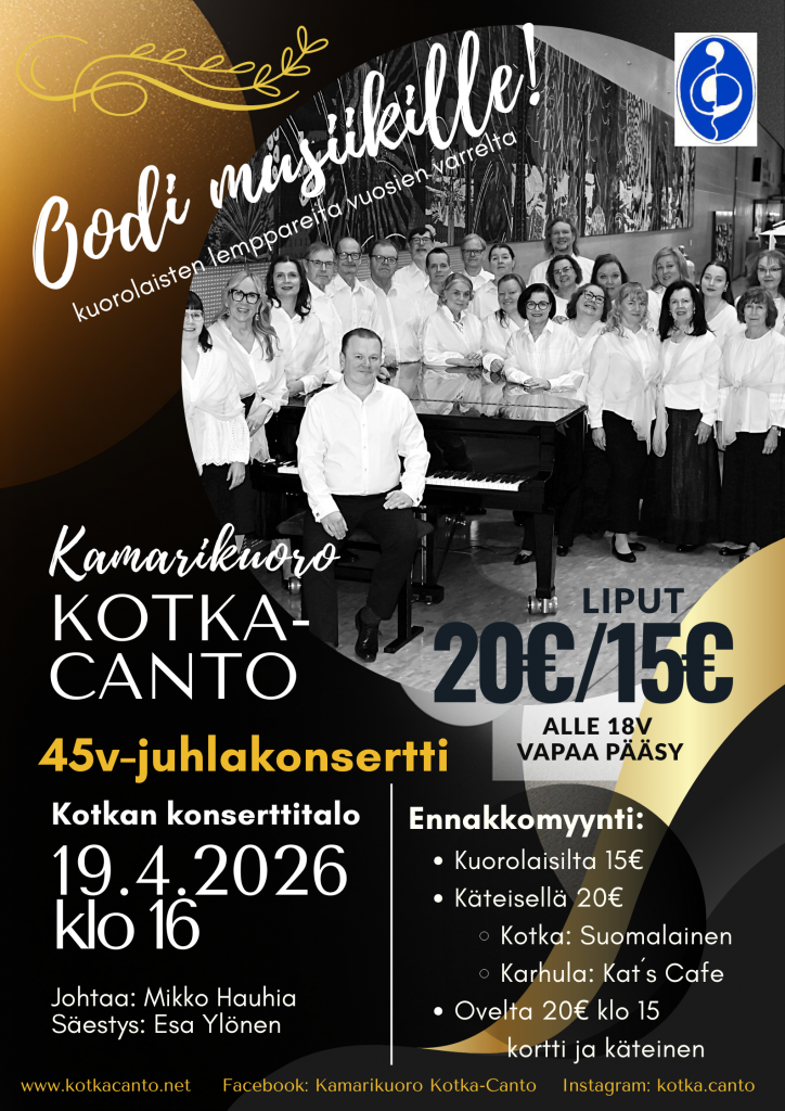 Kuoroon? Miksei! Kamarikuoro Kotka-Canto etsii uusia laulajia riveihinsä. Kun suihkussa laulaminen & karaoke ei enää riitä, on syytä nostaa rimaa korkeammalle. Harjoittelemme yleensä torstaisin klo 18:30 alkaen Kotkan seurakuntakeskuksessa. Kaikkiin äänialoihin mahtuu, tervetuloa kokeilemaan! Lue lisää…