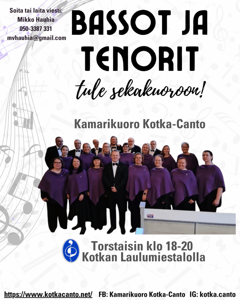 Kotka-Canto harjoittelee torstai-iltaisin klo 18 alkaen Laulumiestalolla (Korkeavuorenkatu 11, 48100 Kotka). Odotamme kuorolaisiltamme sitoutumista harjoituksiin ja yhteiseen tavoitteeseemme tehdä laadukasta musiikkia – unohtamatta laulamisen iloa!
