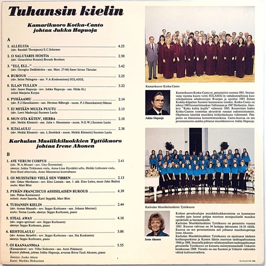 LP – Tuhansin kielin – OMAKUSTANNE KCKTLP-289 – vuodelta :1989, Karhulan Musiikkiluokkien Tyttökuoro, Irene Ahonen